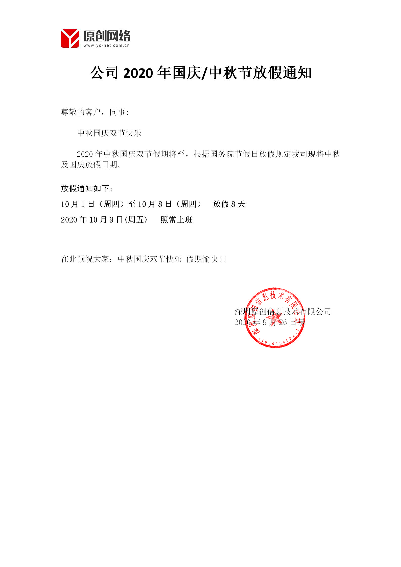 原创网络2020年国庆/中秋放假通知