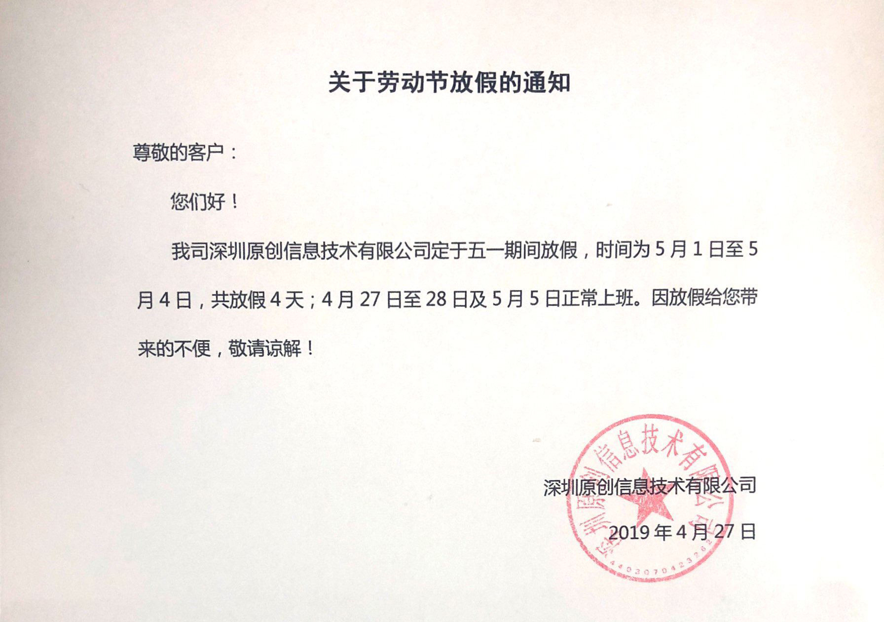 deep色客 有限deep色客现根据国务院办公厅通知精神及deep色客福利政策,将“五一”期间的放假安排如下: 一、2019年5月1日至5月4日,共放假4天; 4月27日至28日及5月5日正常上班。因放假给您带来不便,敬请谅解! 二、放假期间,我司安排客服值班,值班电话:189-2841-3061 祝大家节日快乐!