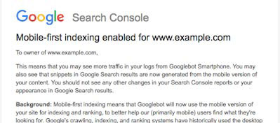 怎样知道自己的网站已经转为mobile-first index?Google说会在Google Search Console中通知站长,消息大致是这个样子: